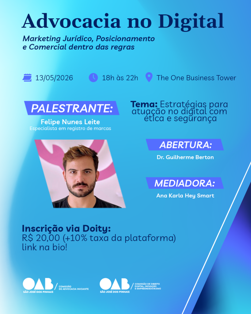 A Comissão de Advocacia Iniciante (CAI), em parceria com a Comissão de Direito Digital, Inovação e Empreendedorismo, promove o evento “Advocacia no Digital”, voltado a advogados que desejam fortalecer sua atuação no ambiente online de forma estratégica e alinhada às normas da profissão. O encontro abordará temas essenciais como marketing jurídico, posicionamento e atuação comercial, […]