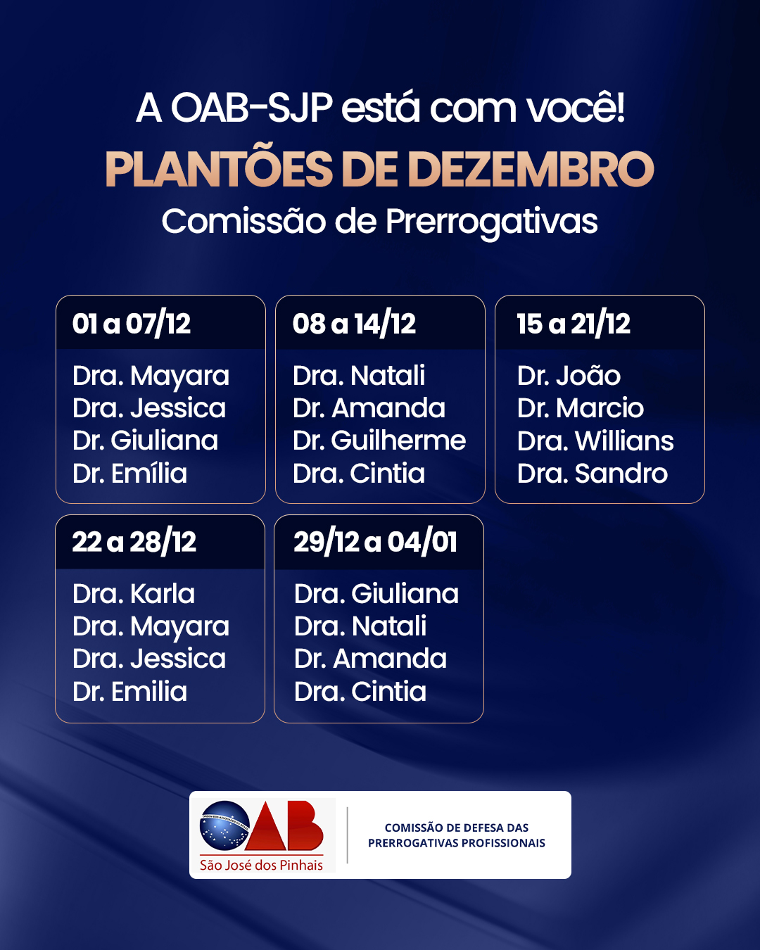 Apresentamos a escala de plantões da Comissão de Prerrogativas para o mês de dezembro