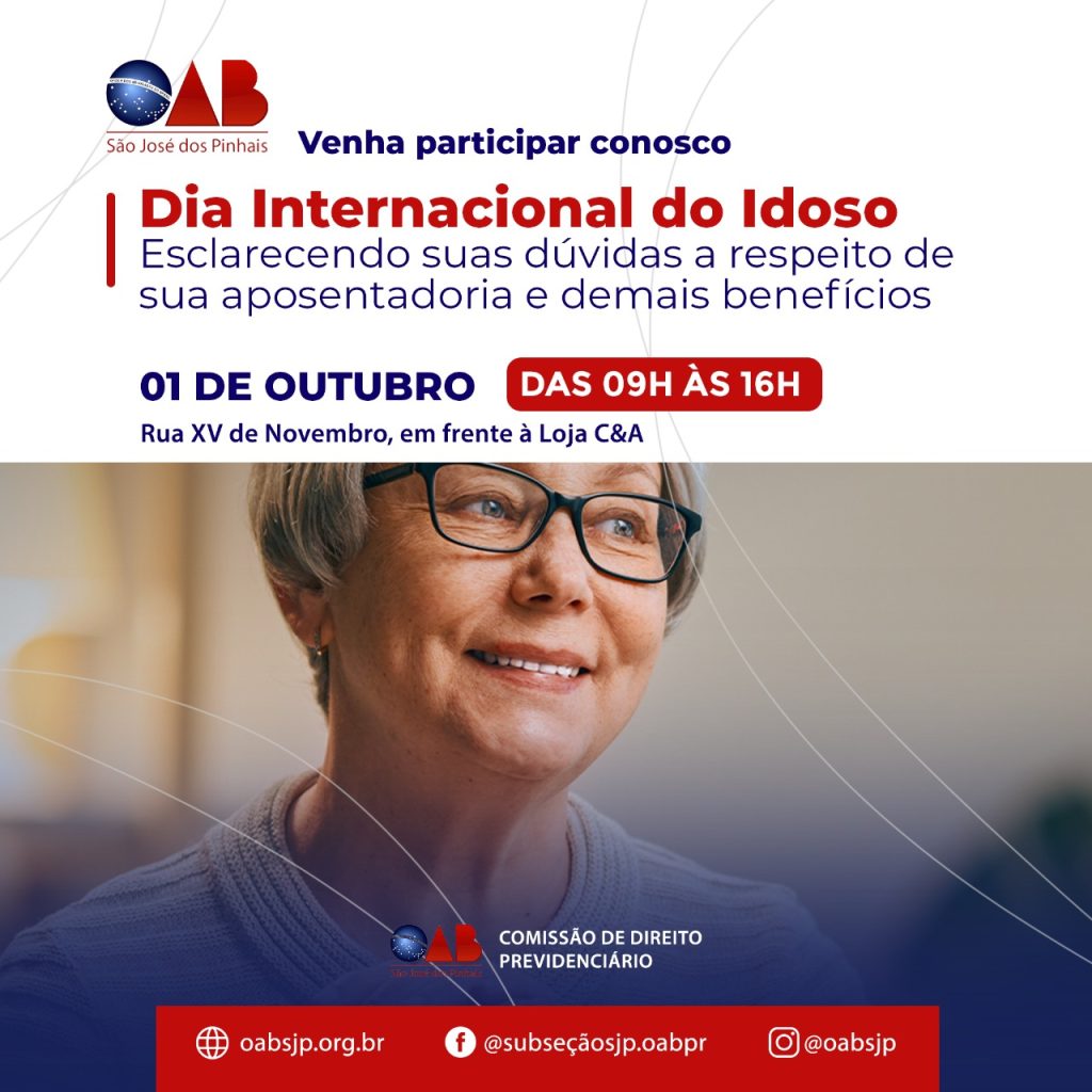 Convidamos todos para participar do evento alusivo ao dia Internacional do Idoso, organizado pela Comissão de Direito Previdenciário da OAB São José dos Pinhais. Estaremos na Rua XV de Novembro no dia 01 de outubro, das 9h às 16h, para esclarecer dúvidas sobre aposentadoria e demais benefícios.