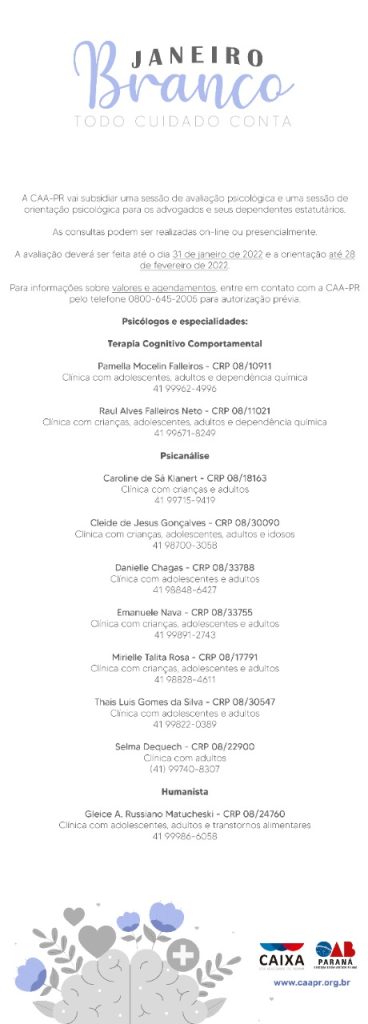 A CAA-PR vai subsidiar uma sessão de avaliação psicológica e uma sessão de orientação psicológica para os advogados e seus dependentes estatutários. As consultas podem ser realizadas on-line ou presencialmente. Confira mais informações no site da CAA-PR