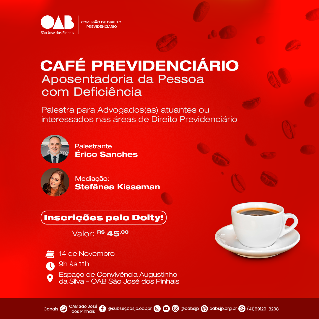 #OABSJP #ComissãoDeDireitoPrevidenciário #CaféPrevidenciário #DireitoPrevidenciário #Aposentadoria #PessoaComDeficiência #AdvocaciaParanaense
