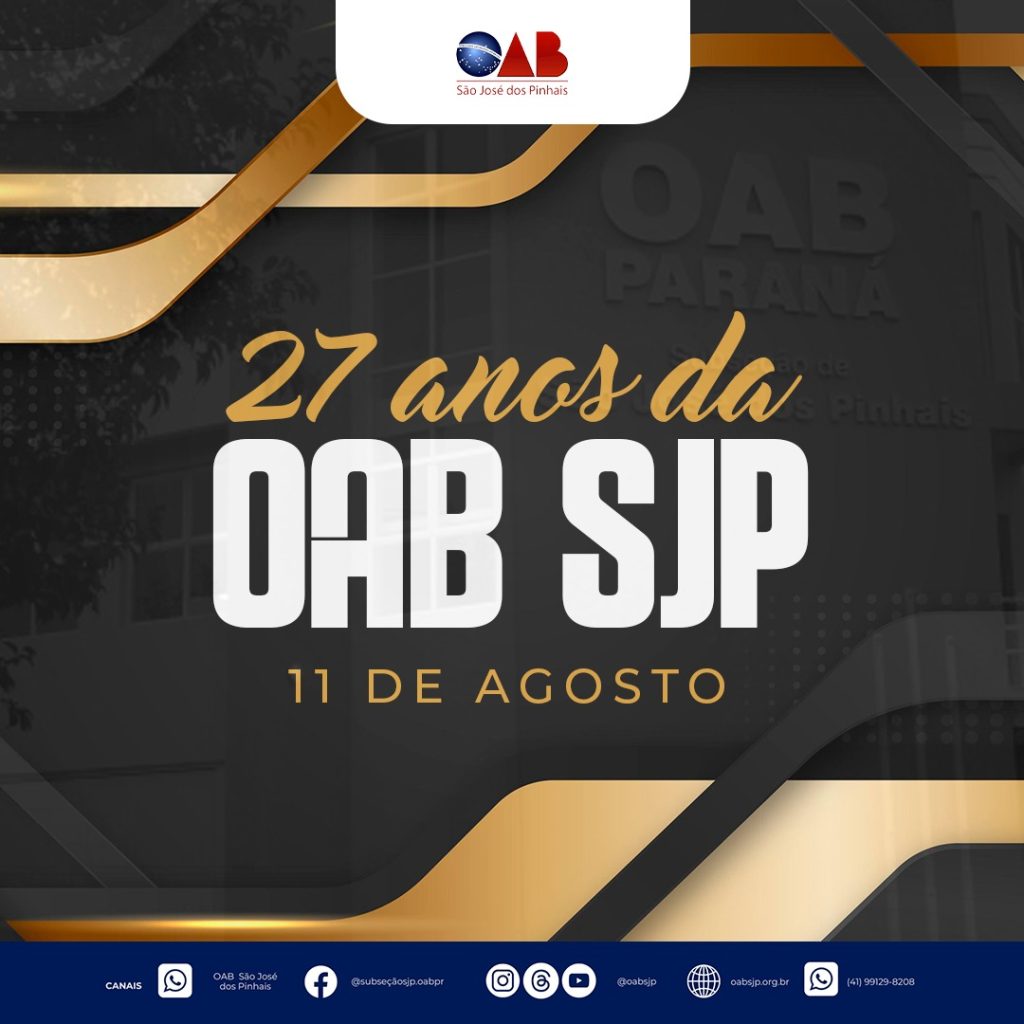 ???? 11 DE AGOSTO – ANIVERSÁRIO DE 27 ANOS DA OAB/SJP A OAB Subseção São José dos Pinhais, celebra neste dia 11 de agosto, 27 anos de compromisso com a advocacia, a OABSJP se mantém firme no trabalho para o fortalecimento da advocacia. Neste aniversário, reafirmamos nosso compromisso na luta pela defesa das prerrogativas, pela […]