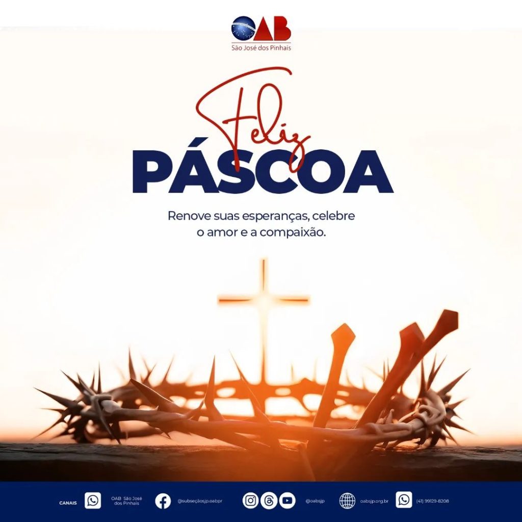 A Páscoa é um momento de renovação e celebração. Que esta data seja repleta de momentos de paz, reflexão e alegria junto aos que amamos. Que os sentimentos de esperança e gratidão se renovem em nossos corações, trazendo luz para todos os dias do ano. São os votos da OAB/SJP. Feliz Páscoa!