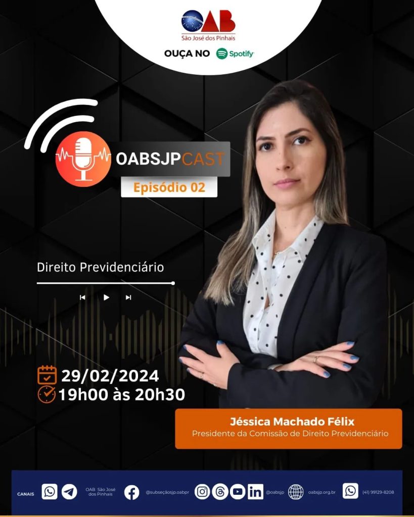 *OABSJPCast Episódio 2: Direito Previdenciário A OABSJP apresenta o segundo episódio do OABSJPCast. Desta vez abordaremos o DIREITO PREVIDENCIÁRIO ao entrevistar a Dra. Jéssica Machado Félix, Presidente da Comissão de Direito Previdenciário, e sua convidada. O objetivo do podcast é oferecer entrevistas qualificadas sobre diversas áreas do Direito e destacar o papel fundamental exercido pelas Comissões da […]
