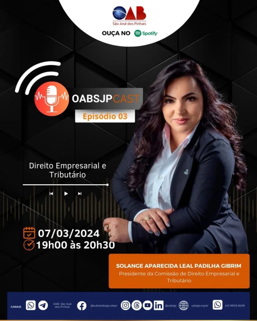 Não perca o 3° episódio do OABSJPCAST, ao vivo no YouTube! Dia 07/03 às 19h mergulhe no mundo do Direito Empresarial e Tributário com a Dra. Solange Aparecida Leal Padilha Gibrim, Presidente da Comissão de Direito Empresarial e Tributário. Após 24 horas estará disponível no Spotify, com esclarecimentos sobre o funcionamento da Comissão e temas […]