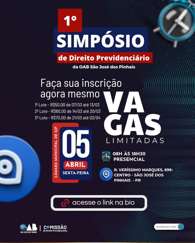 05 de abril, reserve a data! Junte-se a nós no 1° Simpósio de Direito Previdenciário. Prepare-se para mergulhar em discussões relevantes, palestras inspiradoras e para obter insights valiosos sobre questões previdenciárias atuais. O que esperar: Palestras com especialistas renomados e oportunidades de conexão com profissionais deste importante setor Temas em destaque: Reforma da Previdência, atualizações […]