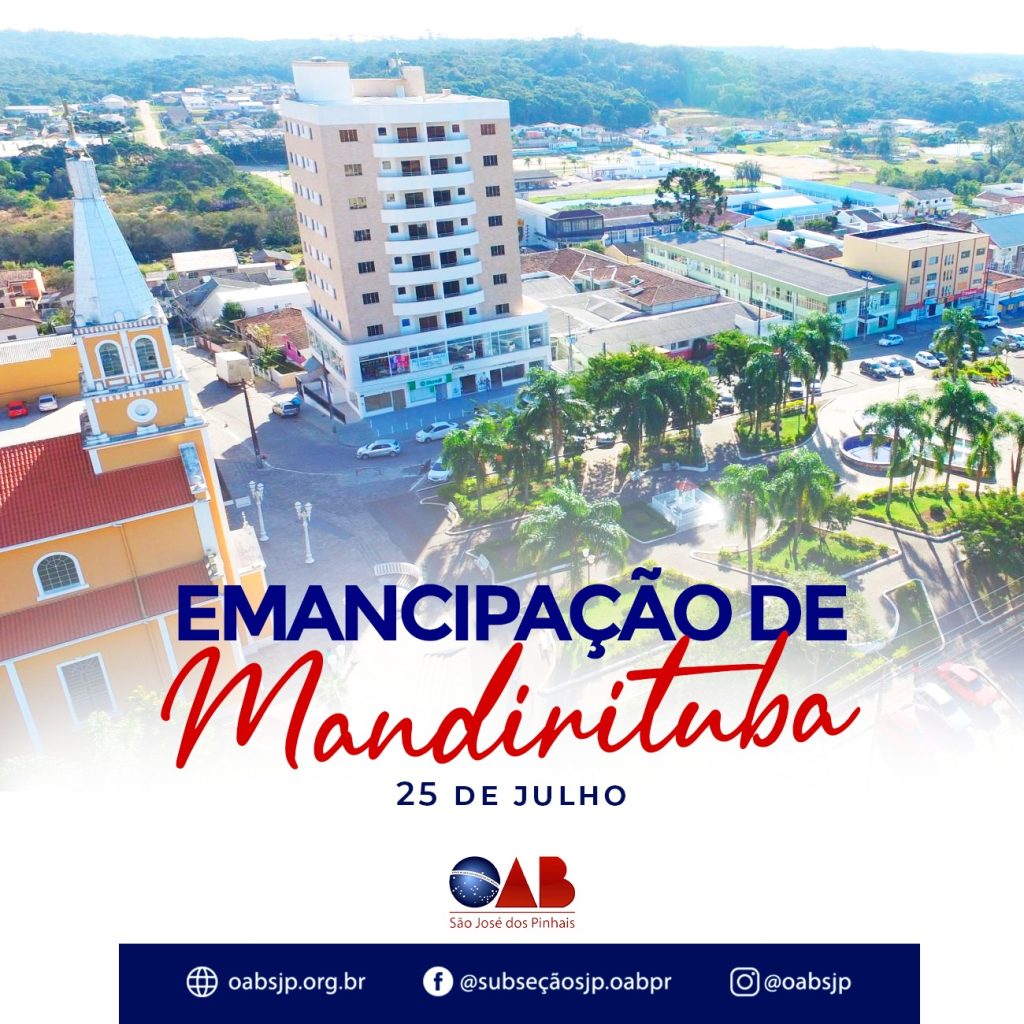 ????️ 25 de Julho – Aniversário da cidade de MANDIRITUBA/PR Mandirituba foi elevada à categoria de município em 25 de julho de 1960, conforme Lei Estadual nº 4.245/1960, desmembrando-se do município de São José dos Pinhais. A OAB/SJP parabeniza todos os mandiritubenses pelos 63 anos de uma das cidades mais pujantes do nosso Estado e […]