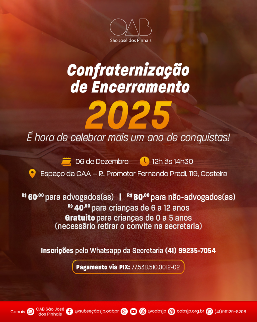 A OAB São José dos Pinhais convida os(as) advogados(as) e seus dependentes para a Confraternização de Encerramento de 2025 — um momento especial para reunir a advocacia, fortalecer vínculos e celebrar tudo o que construímos juntos ao longo do ano. 🍽️ O que está incluso no evento: • Churrasco completo + sobremesa • Água […]
