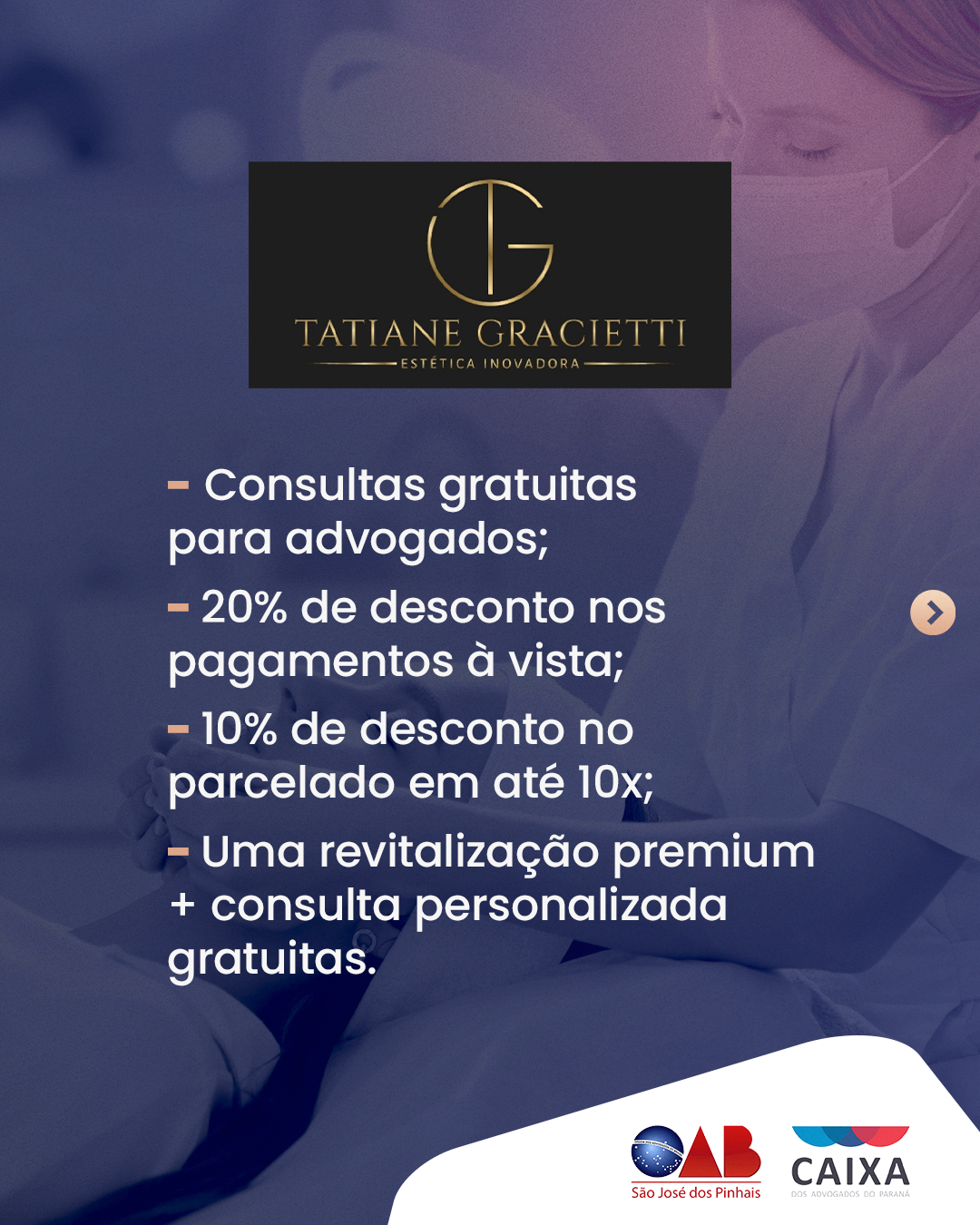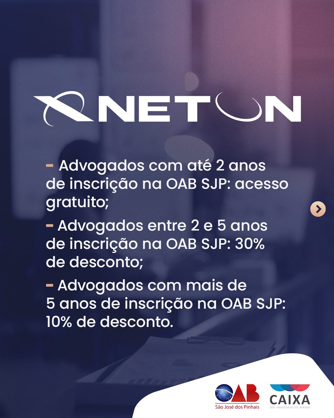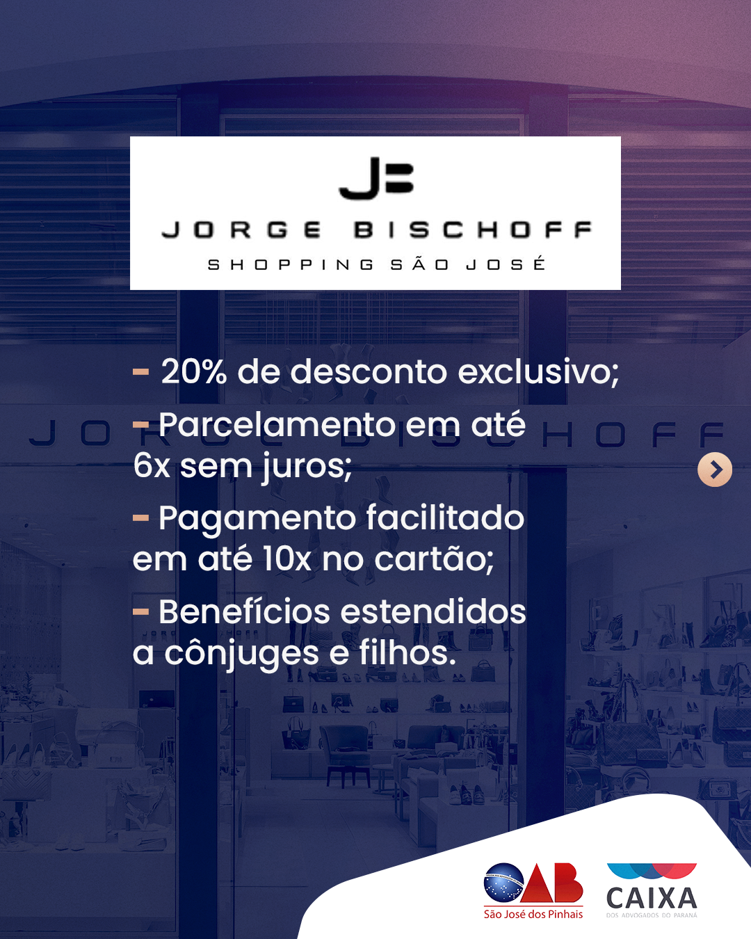 Mais benefícios para você e seus dependentes! A OAB São José dos Pinhais e a Caixa dos Advogados do Paraná firmaram novos convênios com empresas de diferentes segmentos para oferecer serviços e produtos com condições mais que especiais, como descontos e opções de parcelamento. Para aproveitar os benefícios, basta estar devidamente cadastrado e apresentar à empresa um documento comprobatório. As condições são válidas para advogados, estagiários, dependentes, funcionários da CAA-PR, OAB-PR e OABPrev-PR.