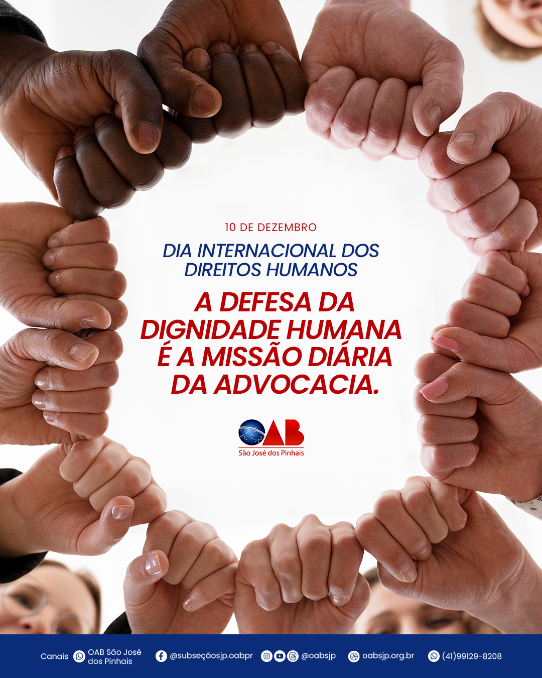 Neste Dia Internacional dos Direitos Humanos, celebramos os princípios que sustentam a liberdade, a igualdade e a justiça. A advocacia permanece como guardiã desses direitos, atuando diariamente na proteção da dignidade humana e no fortalecimento do Estado Democrático de Direito.