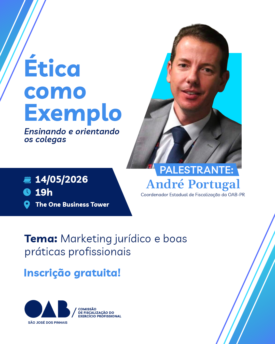 O palestrante André Portugal, Coordenador Estadual de Fiscalização da OAB-PR, trará reflexões práticas e alinhadas às normas da profissão.
