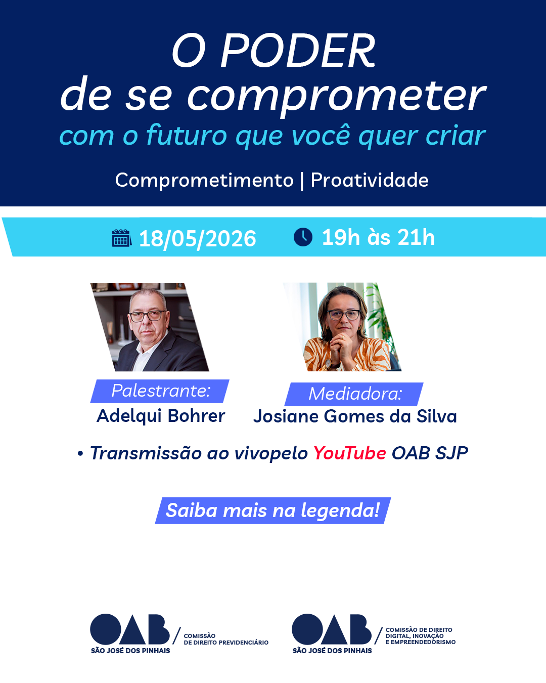 A Comissão de Direito Previdenciário da OAB São José dos Pinhais promove o evento online “O Poder de se comprometer com o futuro que você quer criar”, com foco em comprometimento e proatividade na gestão da carreira e dos escritórios de advocacia.